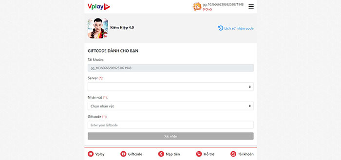 Bước 1: Truy cập trang web nhập code Kiếm Hiệp 4.0 và đăng nhập tài khoản game của mình.