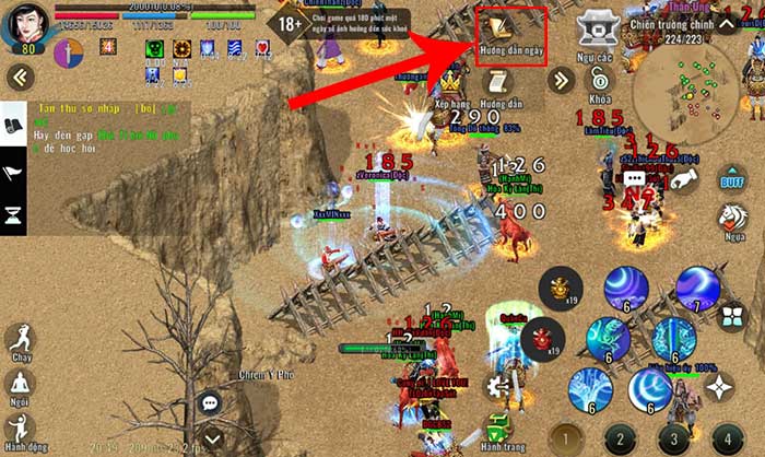 Bước 1: Mở Kiếm Hiệp Tình 2 Mobile trên thiết bị và nhấn vào Hướng dẫn ngày ở góc trên bên phải giao diện chính.