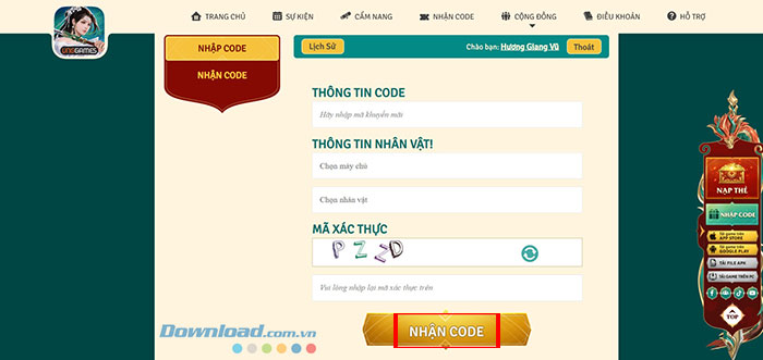Bước 3: Điền mã xác thực và nhấn nút Nhận code.