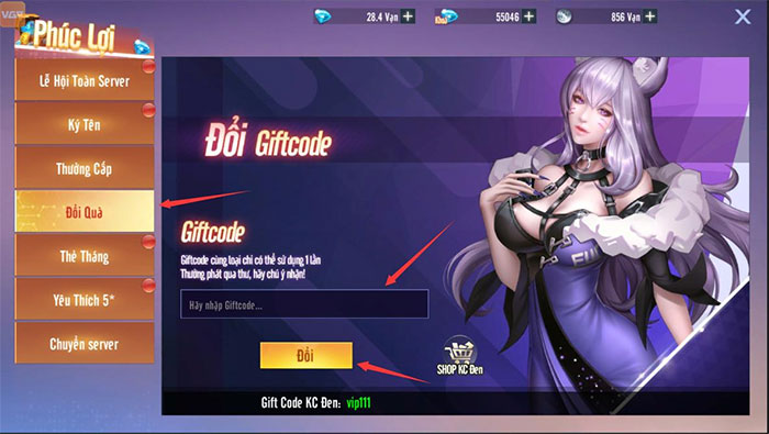 Bước 3: Bấm vào tab Đổi quà, sau đó nhập chính xác hoặc sao chép mã code được cung cấp phía trên vào ô trống Hãy nhập Giftcode.