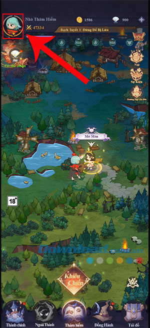 Bước 1: Mở Lạc Vào Cổ Tích trên thiết bị và nhấn vào biểu tượng avatar nhân vật ở góc trên cùng bên trái của giao diện chính.