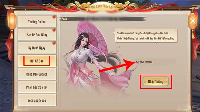 Bước 2: Truy cập tab Đổi lễ bao. Nhập chính xác hoặc sao chép mã code được cung cấp phía trên và dán vào ô trống. Cuối cùng, nhấn Nhận thưởng để lấy phần quà ngay lập tức.