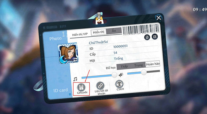 Bước 2: Tại cửa sổ Thông tin nhân vật, nhấn vào Giftcode (biểu tượng hộp quà).