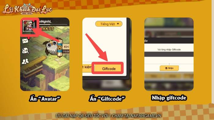 Thao tác nhập giftcode Lữ Khách Đại Lục quy đổi phần thưởng rất đơn giản với các bước được thực hiện như sau: