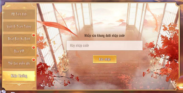 Bước 2: Truy cập tab Nhận thưởng, nhập chính xác hoặc sao chép mã code được cung cấp phía trên và dán vào ô trống, sau đó nhấn nút Xác nhận để dùng code.
