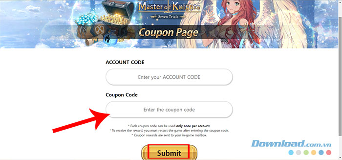 Bước 3: Truy cập trang web đổi code Master of Knights. Dán NeON ID vào ô trống Account Code, nhập mã code được cung cấp phía trên vào mục Coupon Code và nhấn nút Submit.
