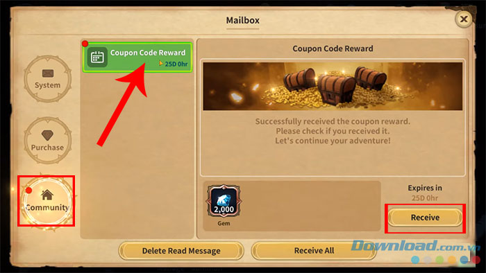 Bước 5: Truy cập tab Community trong Mailbox, mở thư có tiêu đề Coupon Code Reward và nhấn Receive để thu thập phần thưởng tương ứng.