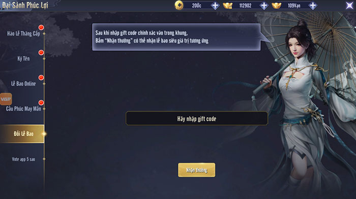 Bước 3: Nhập chính xác hoặc sao chép mã code được cung cấp phía trên vào ô trống Hãy nhập gift code và nhấn nút Nhận thưởng.