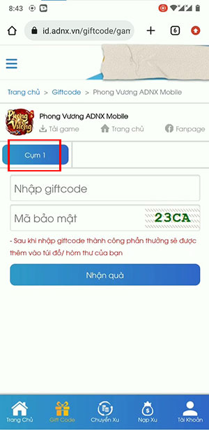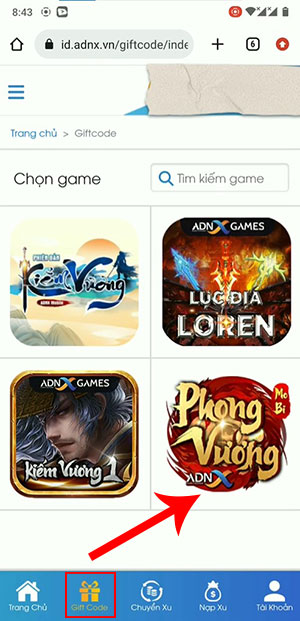 Bước 2: Nhấn vào tab Giftcode và chọn game Phong Vương ADNX Mobile.