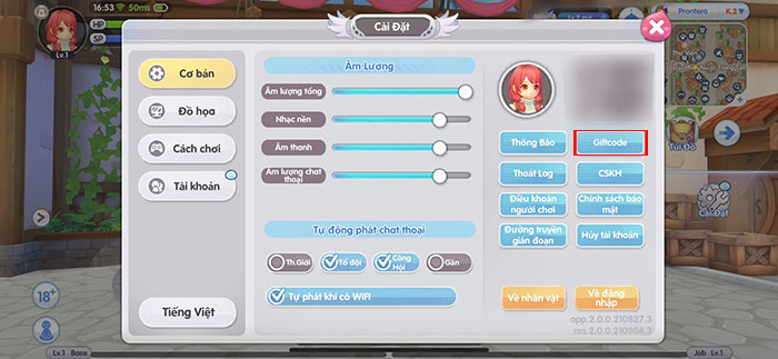 Bước 4: Trong tab Cơ bản, chọn Giftcode.