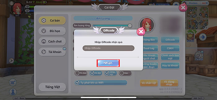 Bước 5: Nhập chính xác mã code và ấn Nhận, phần thưởng sẽ được gửi về ngay lập tức.