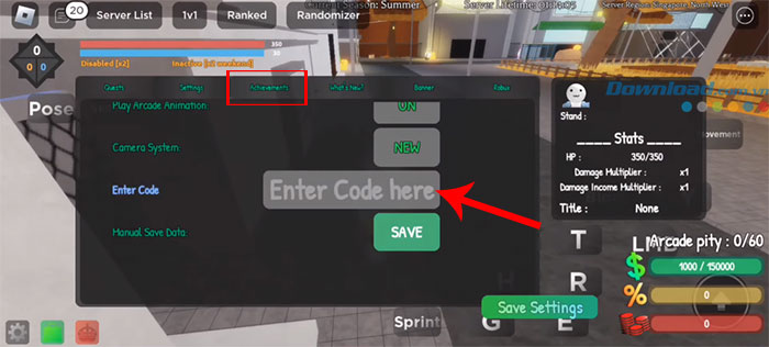 Bước 2: Truy cập tab Achievements, lướt xuống dưới cho đến khi thấy mục Enter code. Tiếp theo, nhập chính xác hoặc sao chép mã code được cung cấp phía trên vào ô trống Enter code here.