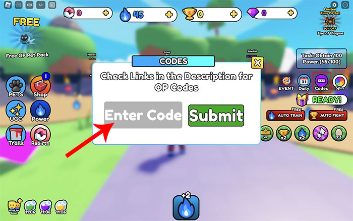 Bước 2: Trong cửa sổ Codes, nhập chính xác hoặc sao chép mã code được cung cấp ở trên rồi dán vào ô trống Enter code. Sau đó nhấn nút Submit để tiến hành dùng code và thu thập phần thưởng tương ứng.