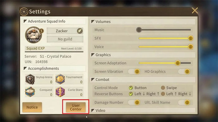 Để nhập code, mọi người cần mở Sky Fortress: Odyssey trên điện thoại, nhấn vào biểu tượng avatar nhân vật ở góc trên bên trái giao diện chính. Sau đó, ấn nút User Center và chọn Gift code exchange. Tiến hành nhập chính xác mã code được cung cấp phía trên, nhấn nút Redeem và mở thư trong game để thu thập phần thưởng.