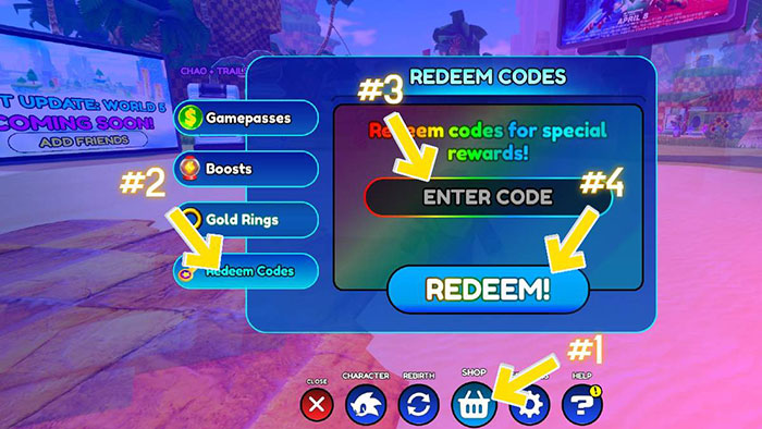Thao tác nhập code trong Sonic Speed Simulator rất đơn giản với các bước sau đây:
