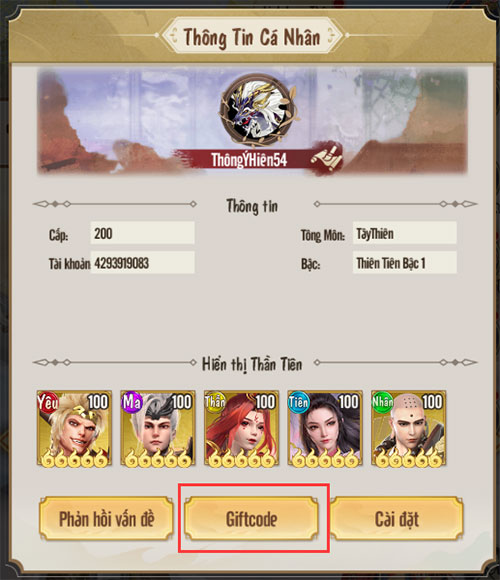 Bước 2: Nhấn vào nút Giftcode cửa sổ Thông tin cá nhân.