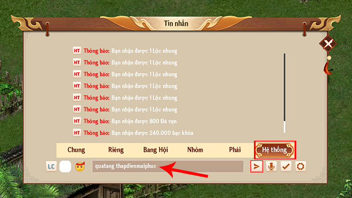 Bước 2: Tại cửa sổ Tin nhắn, truy cập tab Hệ thống, nhập code theo cú pháp quatang + dấu cách + mã code (ví dụ: quatang thapdienmaiphuc) vào khung chat. Sau đó, nhấn vào biểu tượng gửi để dùng code.