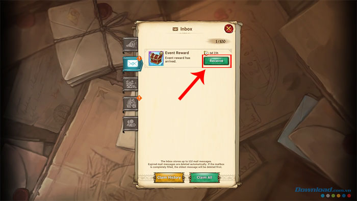 Bước 6: Chạm vào tab phong bì thư, nhấn nút Receive hoặc Claim All để thu thập phần thưởng.