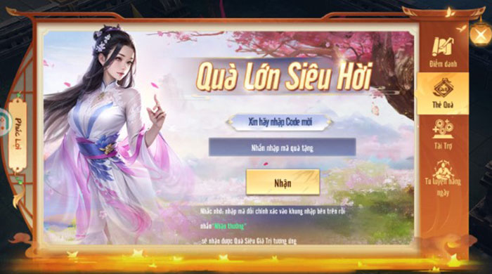 Bước 2: Trong giao diện Thẻ Quà vừa hiển thị, người chơi cần nhập chính xác hoặc sao chép mã code được cung cấp phía trên và dán vào ô trống. Sau đó, nhấn nút Nhận để dùng code và thu thập phần thưởng trong Thư của trò chơi.
