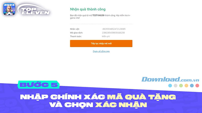 Bước 5: Nếu nhập mã thành công, mọi người sẽ nhận được thông báo Nhận quà thành công. Lúc này, game thủ chỉ cần mở lại app Top Eleven VNG để kiểm tra, quà tặng sẽ được cộng trực tiếp vào tài khoản.