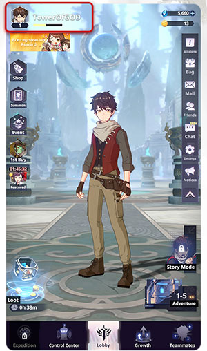 Bước 1: Mở Tower of God: New World trên thiết bị và nhấn vào biểu tượng avatar nhân vật ở góc trên cùng bên trái giao diện chính.