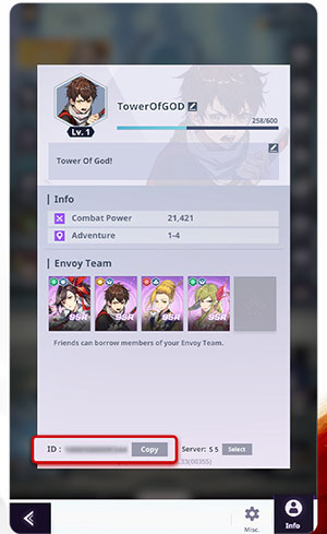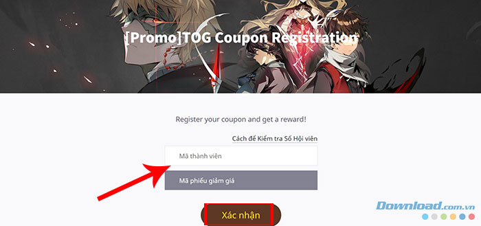 Bước 3: Đi đến trang đổi mã chính thức của Tower of God: New World. Sau đó, nhập ID đã sao chép vào phần Mã thành viên và nhập chính xác code được cung cấp phía trên vào ô Mã phiếu giảm giá.