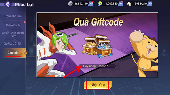 Bước 2: Trong cửa sổ Phúc Lợi vừa mở, truy cập tab Giftcode. Nhập chính xác hoặc sao chép mã code được cung cấp ở phía trên và dán vào ô trống Hãy nhập Giftcode.