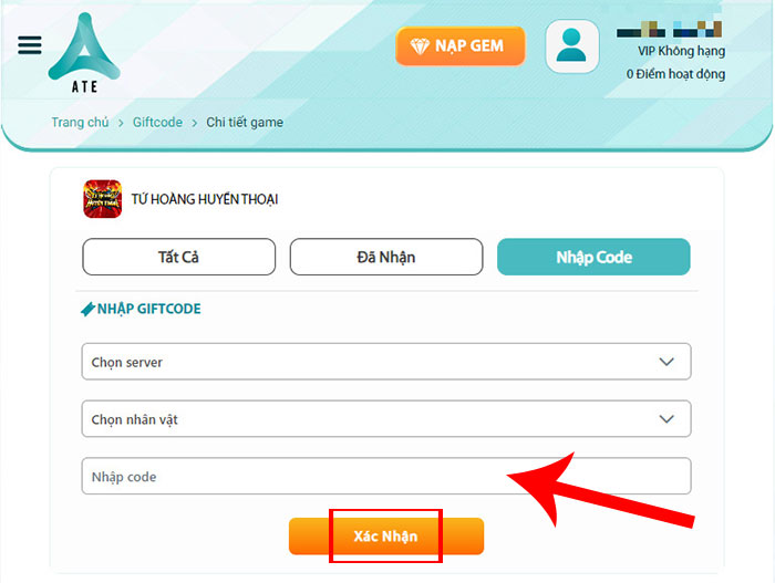 Người chơi không thể nhập code trực tiếp trong game mà sẽ cần sử dụng tại trang nhập code Tứ Hoàng Huyền Thoại, với các bước chi tiết như sau: