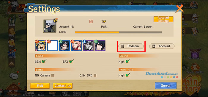 Ultimate Hokage Duel có một trung tâm đổi mã trong trò chơi mà game thủ có thể truy cập dễ dàng. Do đó, mọi người không cần phải truy cập trang web bên ngoài và nhập mã sau đó quay lại trò chơi để xem chúng có hoạt động hay không. Chỉ cần làm theo các bước dưới đây và nhận các vật phẩm hữu ích ngay lập tức.