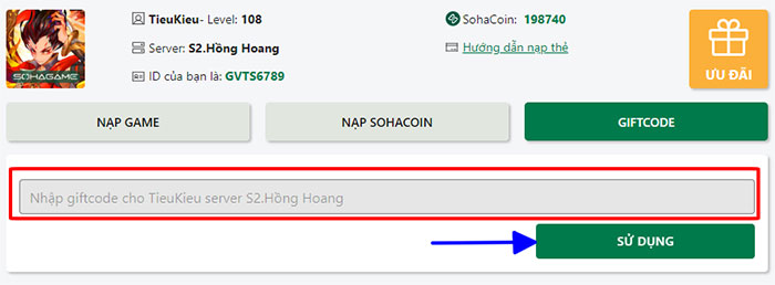 Bước 4: Truy cập tab Giftcode, nhập chính xác hoặc sao chép mã code được cung cấp phía trên rồi dán vào ô trống và nhấn nút Sử dụng.