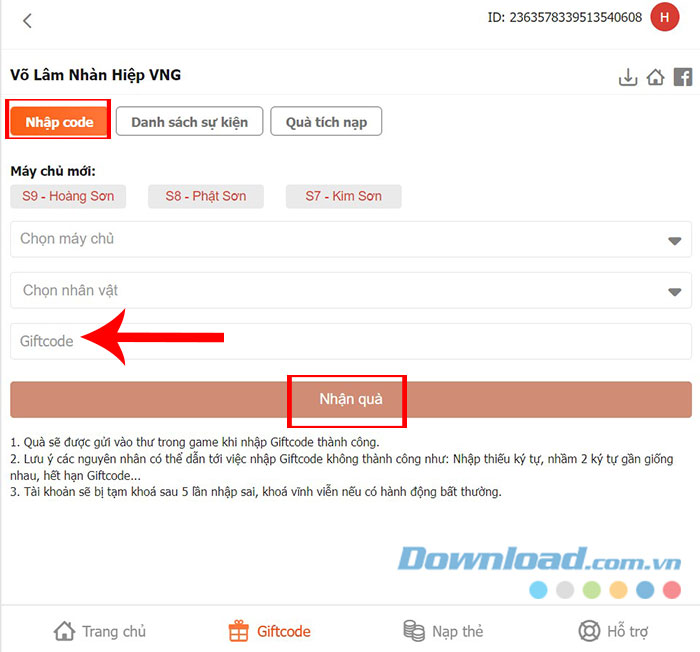 Bước 4: Nhập chính xác hoặc sao chép mã code được cung cấp phía trên vào ô Giftcode.