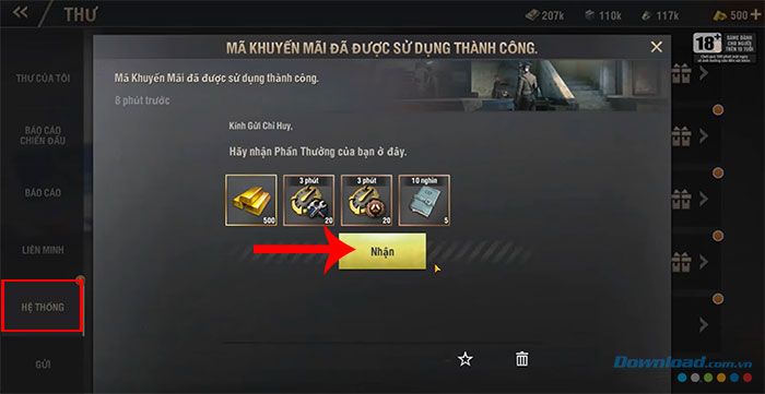 Bước 5: Nếu xuất hiện thông báo nhập code thành công, hãy quay lại hộp thư trong trò chơi, chọn tab Hệ thống, mở thư và nhấn nút Nhận để thu thập phần thưởng.