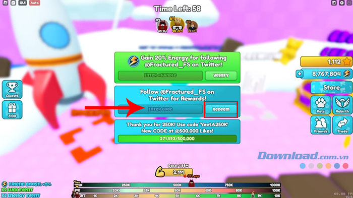 Thao tác nhập code trong Yeet A Friend rất đơn giản, tương tự như các trò chơi Roblox khác, với các bước dưới đây: