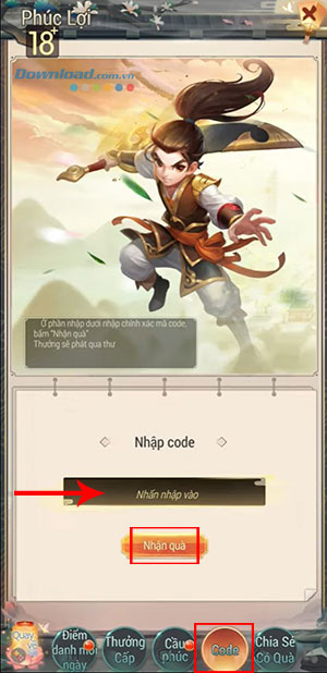 Bước 2: Nhấn vào tab Code. Nhập chính xác hoặc sao chép các mã code được cung cấp ở mục trên vào ô trống và nhấn nút Nhận quà.