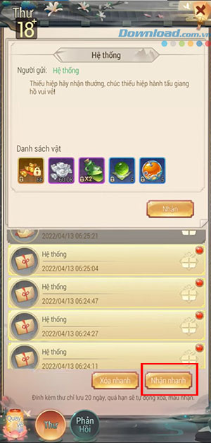 Bước 3: Nếu mã code còn hoạt động, phần quà sẽ được gửi tới hộp thư trong trò chơi. Quay lại giao diện chính, mở hộp thư và chọn Nhận nhanh để thu thập tất cả phần quà.