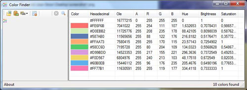 Colors Finder được thiết kế để giúp bạn giải quyết vấn đề trên. Colors Finder sẽ phân tích bức ảnh bạn cung cấp rồi từ đó liệt kê danh sách các màu sắc có trên bức ảnh đó theo từng loại khác nhau như: Hex, OLE, RGC, Hue, độ sáng...