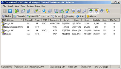 CommView for WiFi có thể quét WiFi trạm và các điểm truy cập, cũng như chụp các gói tin trên mạng 802.11a, 802.11b và 802.11g.