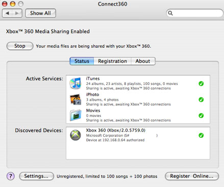 Connect360 tự động gắn chỉ số thư viện iTunes và iPhoto và chia sẻ chúng với tài khoản Xbox 360 của bạn. Sau đó, bạn có thể sử dụng Dashboard của Xbox 360 để tìm duyệt và chơi nhạc, sắp xếp lại chúng trên máy tính của bạn.