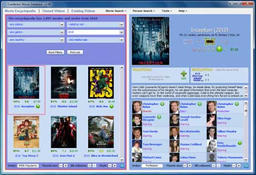 Coollector Movie Database 3.08 là chương trình miễn phí, quản lý những bộ phim bạn đã xem, bộ sưu tập video. Điều đặc biệt là nó không chỉ quản lý các đoạn video bạn sở hữu, mà còn tất cả các phim bạn đã xem ở bất cứ nguồn nào. Nó giúp bạn xếp hạng những bộ phim bạn thích nhất đến không thích, thể loại nào được xem nhiều nhất, khi cần nó sẽ tự động tìm kiếm và tải về để phục vụ bạn.