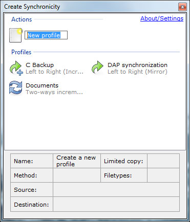Create Synchronicity là ứng dụng mã mở nhỏ gọn được phát triển bởi VB.NET, giúp đồng bộ hóa và sao lưu các file và folder. Ứng dụng này sẽ giúp việc đồng bộ hóa các file trở lên dễ dàng hơn, cũng như vẫn giữ được các tùy chỉnh. Create Synchronicity là ứng dụng đa ngôn ngữ và đặc biệt nhẹ. Ứng dụng này có rất nhiều tính năng cao cấp, bao gồm chế độ đa đồng bộ hóa, hoàn thành DST, chế độ lựa chọn file/folder cao cấp,…. Phần mềm này cũng có giao diện khá đẹp.
