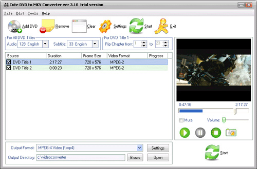 Cute DVD to MKV Converter là phần mềm chuyển đổi video DVD dễ sử dụng nhất hiện có. Phần mềm này có thể chuyển đổi gần như bất kì dạng DVD nào sang định dạng video MKV. Phần mềm rip DVD mạnh mẽ này không chỉ có thể chuyển đổi DVD sang DivX, XviD, MOV, MPEG-4, MPEG, WMV, MPEG-2, H.264, AVI, DV mà còn có thể tách audio sang định dạng MP3, WMA, WAV từ video DVD.