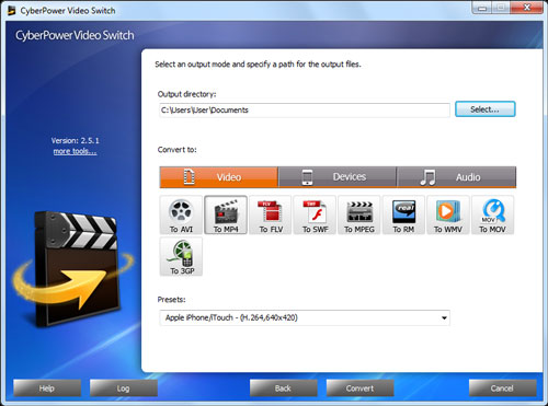 CyberPower Video Switch 2.5.1 là một phần mềm chuyển đổi video cực kỳ mạnh mẽ và đầy đủ tính năng có thể chuyển đổi video giữa các định dạng khác nhau như MPEG, WMV, AVI, MP4, FLV, 3GP, MOV và nhiều người khác với tốc độ cao và chất lượng tuyệt vời. Bằng cách lợi dụng điều này dễ dàng chuyển đổi định dạng video, bạn có thể thưởng thức các video yêu thích của bạn và âm nhạc tự do trên bất kỳ máy nghe nhạc cầm tay như iPhone, iPod, iPad, Apple TV, PSP, vv. Nó cũng cho phép bạn chuyển đổi video sang định dạng HD và cho phép bạn kinh nghiệm chưa từng có bộ phim độ nét cao.