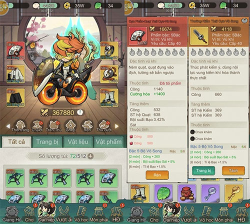 Đại Hiệp Chạy Đi đã xây dựng hệ thống trang bị vô cùng chi tiết, do đó người chơi sẽ cần dành thời gian nghiên cứu từng trang bị để tìm cho mình 1 set phù hợp nhất với nhân vật, từ đó tối ưu hóa sức mạnh để thành công sinh tồn qua đám kẻ thù hung hãn trong Đại Hiệp Chạy Đi.