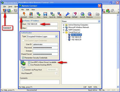 Mở hộp thoại Remote Connect, nhập địa chỉ IP máy Remote vào ô Host, nhập User ID, Password trong mục Authentication với kiểu Encrypted Windows Logon, chọn Use MRC’s Mirror Driver if available, nhấn Connect. Nếu Agent Service chưa được cài trên máy Remote, chương trình sẽ tự động cài đặt.