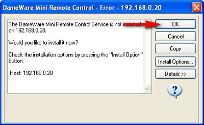 - Nhắp nút Connect để thực hiện việc kết nối. Trong lần kết nối đầu tiên đến máy Remote, nếu Agent Service chưa được cài trên máy Remote, DameWare Mini Remote Control sẽ tự động cài nó. Xuất hiện hộp thoại thông báo là việc Agent Service chưa được cài đặt trên máy Remote và hỏi bạn xem có muốn cài đặt hay không.
