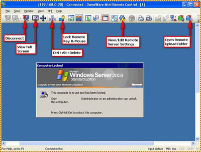 Trên cửa sổ chính của chương trình là màn hình của máy Remote. Nếu máy Remote đang ở chế độ logoff, có thể gửi lệnh tương ứng tổ hợp phím Ctrl + Alt + Delete để đăng nhập vào hệ thống và thực hiện công việc. Trên cửa sổ chính của DWMRC, chú ý các tính năng sau: