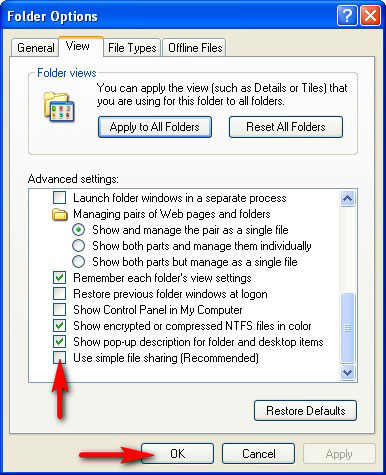 Trong hộp thoại Folder Options, chọn tab View. Dịch chuyển thanh cuộn của Advanced settings xuống cuối cùng và bỏ chọn Use simple file sharing. Sau đó nhắp OK để xác nhận.