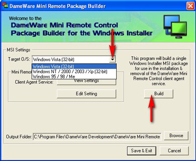 - Trên hộp thoại DameWare Mini Remote Package Builder, chọn hệ điều hành sử dụng trên máy Remote, sau đó nhắp nút Build để thực hiện việc tạo gói cài đặt. Với Windows NT/2000/XP/2003, sẽ tạo file DWRCS32.MSI, với Vista, sẽ tạo file DWRCSVista32.MSI trong Output Folder. Các file này khá nhỏ (khoảng 860Kb) và bạn có thể copy sang các máy Remote để thực hiện việc cài đặt trên đó. Để gỡ bỏ Agent Service trên máy Remote, trên giao diện chính của chương trình DWMRC, chọn menu File > Remove Service. sử dụng RDP DWMRC ngoài việc hỗ trợ giao thức riêng là MRC Mini Driver, nó cũng hỗ trợ giao thức RDP để kết nối với Remote Desktop có sẵn trên XP, Vista hoặc Terminal Service có sẵn trên Windows 2000/2003. Trong trường hợp máy Remote đã cấu hình sẵn Remote Desktop hoặc Terminal Service, trên hộp thoại Remote Connect có thể lựa chọn tính năng này để thực kiện kết nối mà không cần phải cài MRC Mini Driver trên máy Remote.