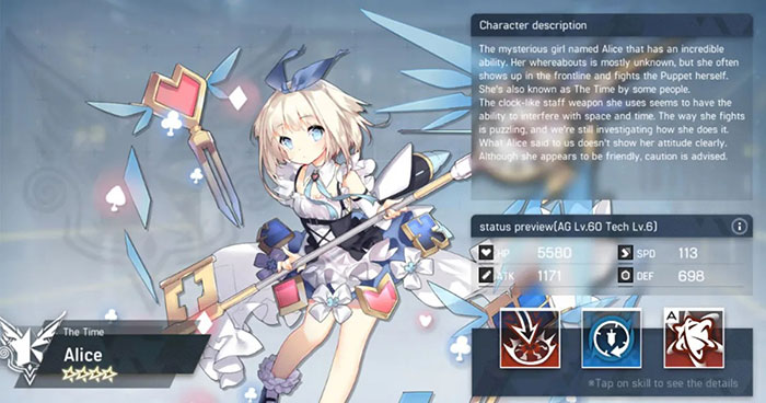 Mặc dù thiếu sức mạnh tấn công, bộ kỹ năng Alice cũng đã quá đủ để bù đắp. Alice sẽ giúp đồng minh có nhiều lượt tấn công hơn, trong khi trì hoãn lượt mà kẻ thù có thể thực hiện nhờ vào debuff Slow và Ultimate Skill của mình.