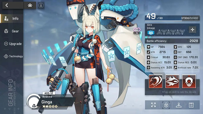 Ginga là một Thunder Assault, sở hữu Ultimate Skill mạnh mẽ giúp tăng sát thương gây ra dựa trên số lần debuff lên kẻ địch mục tiêu. Các kỹ năng khác giúp hỗ trợ tiềm năng tấn công của cô ấy, áp dụng các hiệu ứng Shock với tỷ lệ khá cao. Nhân vật này là yếu tố chính để cho Promised Land, nơi nhiều người chơi sẽ có được trang bị cần thiết cho nội dung cấp cao.